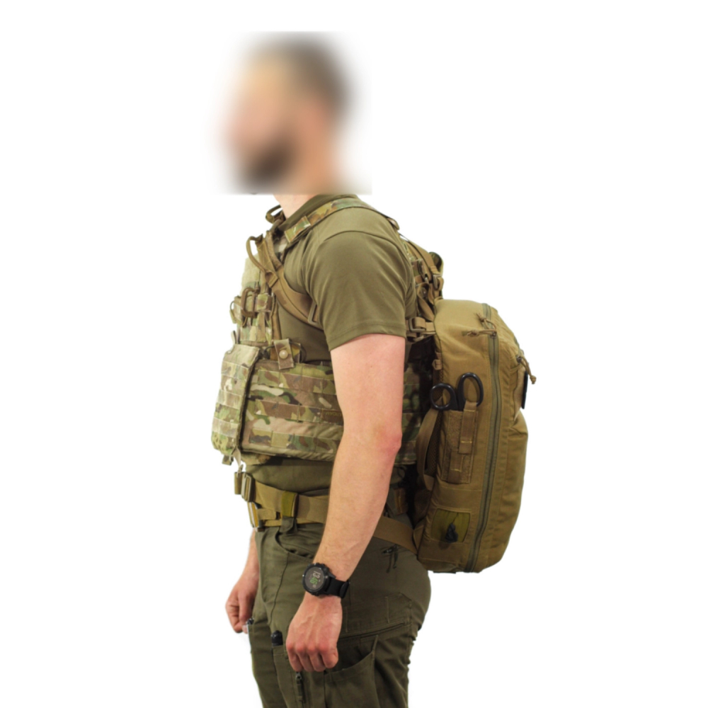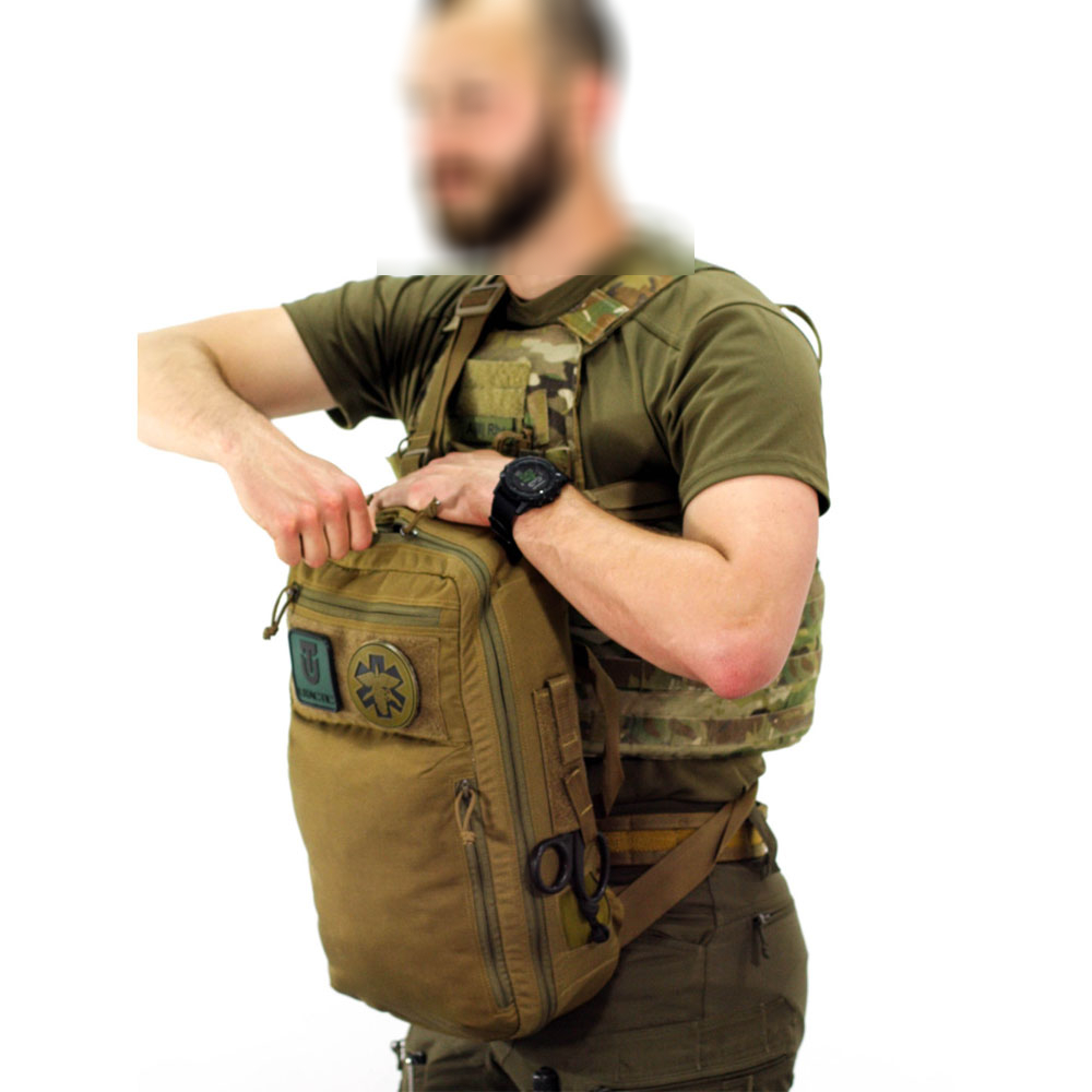 Στο μπροστινό μέρος υπάρχουν δύο θήκες γρήγορης πρόσβασης. Η μικρή οριζόντια χωρά αιμοστατικά εργαλεία. Η διάτρητη κάθετη θήκη ανοίγει από έξω και από μέσα. Έτσι εξυπηρετεί tourniquets και επιδέσμους. Στα πλαϊνά υπάρχουν ενσωματωμένες θήκες γαντιών. Επίσης έχει σύστημα διπλής πρόσβασης για ψαλίδι τραύματος.