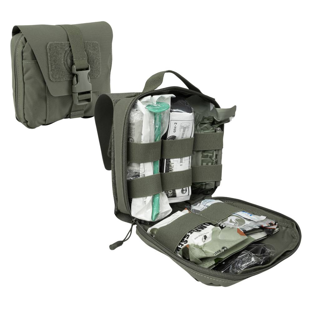 Συμπαγές τακτικό IFAK Level-II με γρήγορη αποσύνδεση Velcro. Πλήρης εξοπλισμός αιμόστασης: τουρνικέ, αιμοστατική γάζα, διπλό chest seal, NPA. Cordura, MOLLE/PALS. 340γρ.